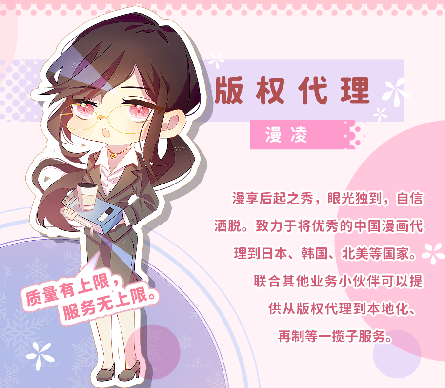 奇漫屋于2017年成立于北京,现已在香港、成都、沈阳三地设有子公司,业务涉及漫画本地化、漫画版权代理、漫画再制、原创漫画创作等多个领域。 我们的理念:择一事终一生,奇漫屋希望做漫画行业的匠人,希望为每个用户提供极致的服务和作品。